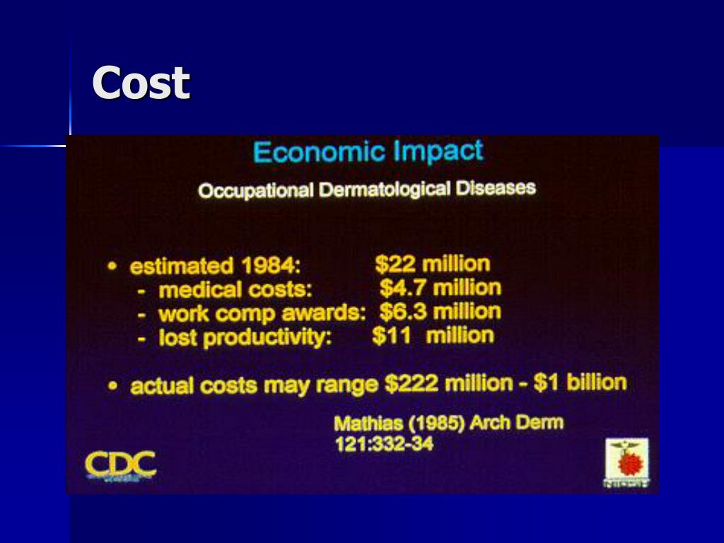 Changes in Incidence (1993 - 1999) • From 1993 to 1999 there have been further changes in the number of cases, incidence and proportion of occupational skin diseases. In 1999 BLS data showed 44,600 total cases of occupational skin diseases/disorders, or an incidence of 49 cases per 100,000. In 1999, 12% of all occupational illnesses reported were skin diseases/disorders.