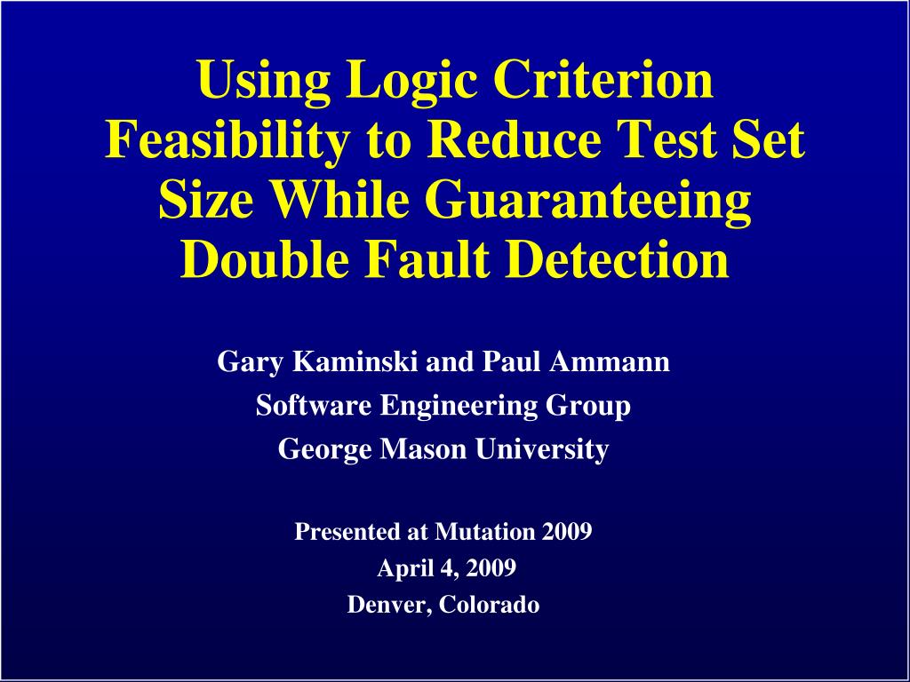 Using Logic Criterion Feasibility to Reduce Test Set Size While Guaranteeing Double Fault Detection Gary Kaminski and Paul Ammann Software Engineering Group George Mason University Presented at Mutation 2009 April 4, 2009 Denver, Colorado