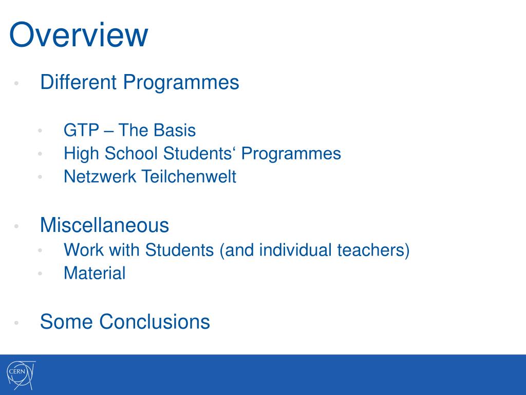 German Programmes for teachers and high school students. Sascha Marc Schmeling Scandinavian Teachers ‘ Programme Review June 19th, 2013. Overview. Different Programmes GTP – The Basis High School Students ‘ Programmes Netzwerk Teilchenwelt Miscellaneous
