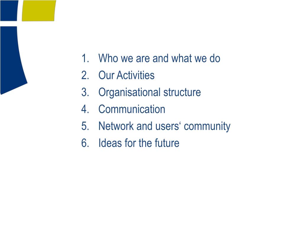 Who we are and what we do Our Activities Organisational structure Communication Network and users‘ community Ideas for the future