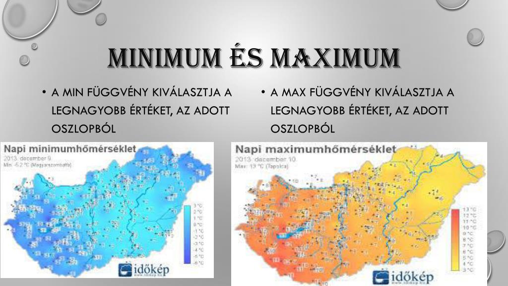 MINIMuM ÉS MAXIMuM • A MIN függvény kiválasztja a legnagyobb értéket, az adott oszlopból • A MAX függvény kiválasztja a legnagyobb értéket, az adott oszlopból