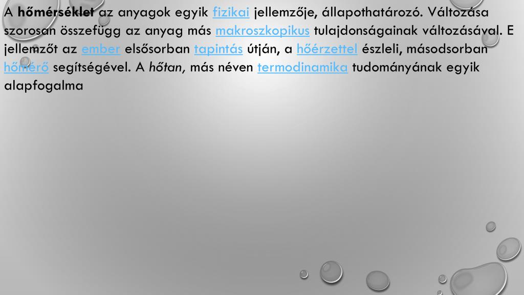 KÉPEk ÉS INFOMÁCIOK A meleg átirányít ide. A homoszexualitásról az LMBT cikkben olvashatsz. A hőmérséklet az anyagok egyik fizikai jellemzője, állapothatározó. Változása szorosan összefügg az anyag más makroszkopikus tulajdonságainak változásával. E jellemzőt az ember elsősorban tapintás útján, a hőérzettel észleli, másodsorban hőmérő segítségével. A hőtan, más néven termodinamika tudományának egyik alapfogalma. A hőmérséklet az intenzív mennyiségek közé tartozik, tehát nem additív, két test között hőáramlással kiegyenlítődésre törekszik. A hőmérőben található folyadék (higany, alkohol) a hőmérséklet változásai miatt halad fel, le. Fizikai szempontból a hőmérséklet az anyagot felépítő részecskék átlagos mozgási energiájával kapcsolatos mennyiség. A részecskék egy szabadsági fokra (például egy kitüntetett irányú mozgásra) jutó mozgási energiájának hosszabb időtávon mért átlaga T hőmérsékleten kT, ahol k a Boltzmann-állandó. Hangsúlyozzuk tehát, hogy a hőmérséklet egy olyan fizikai mennyiség, amit per definitionem arányosnak választottak az anyagrészecskék kinetikus energiájával, és a k arányossági tényező, a Boltzmann-állandó, a választott skáláink miatt lesz 1,380 6505(24) ·10‒23 joule/kelvin értékű. Látszik, hogy a hőmérséklet statisztikus fogalom, ilyen szempontú leírása a statisztikus fizika témakörébe tartozik. A hőmérők hőmérséklet mértékét fokokban adják meg, de több mértékegysége létezik, melyek kifejlesztőik nevével azonosak