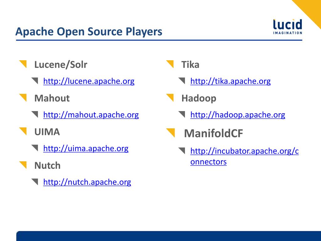Apache Open Source Players • Lucene/Solr • http://lucene.apache.org • Mahout • http://mahout.apache.org • UIMA • http://uima.apache.org • Nutch • http://nutch.apache.org • Tika • http://tika.apache.org • Hadoop • http://hadoop.apache.org • ManifoldCF • http://incubator.apache.org/connectors