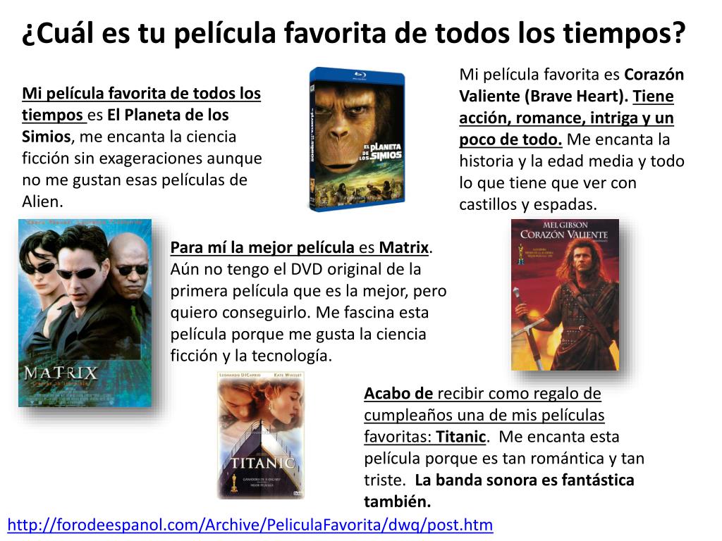 ¿Cuál es tu película favorita de todos los tiempos? Mi película favorita es Corazón Valiente (BraveHeart). Tiene acción, romance, intriga y un poco de todo.Me encanta la historia y la edad media y todo lo que tiene que ver con castillos y espadas. Mi película favorita de todos los tiempos es El Planeta de los Simios, me encanta la ciencia ficción sin exageraciones aunque no me gustan esas películas de Alien. Para mí la mejor película es Matrix. Aún no tengo el DVD original de la primera película que es la mejor, pero quiero conseguirlo. Me fascina esta película porque me gusta la ciencia ficción y la tecnología. Acabo de recibir como regalo de cumpleaños una de mis películas favoritas: Titanic. Me encanta esta película porque es tan romántica y tan triste. La banda sonora es fantástica también. http://forodeespanol.com/Archive/PeliculaFavorita/dwq/post.htm