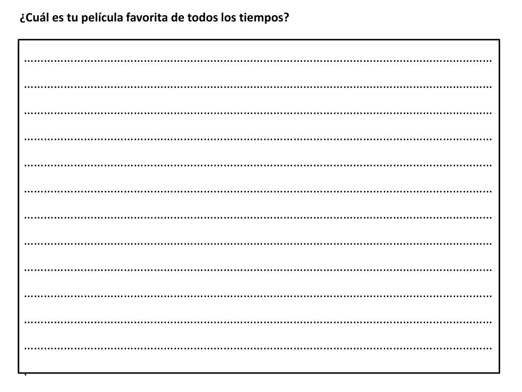 1. ¿Quétipo de películaes? ……………………………………………. 2. ¿Para quiénes ? Esunapelículapara…… porque.. Mipelículafavorita se llama… 3. ¿Dóndetienelugar? Tienelugar en…. 4. ¿Cómoes? Piensoquees…y … porque