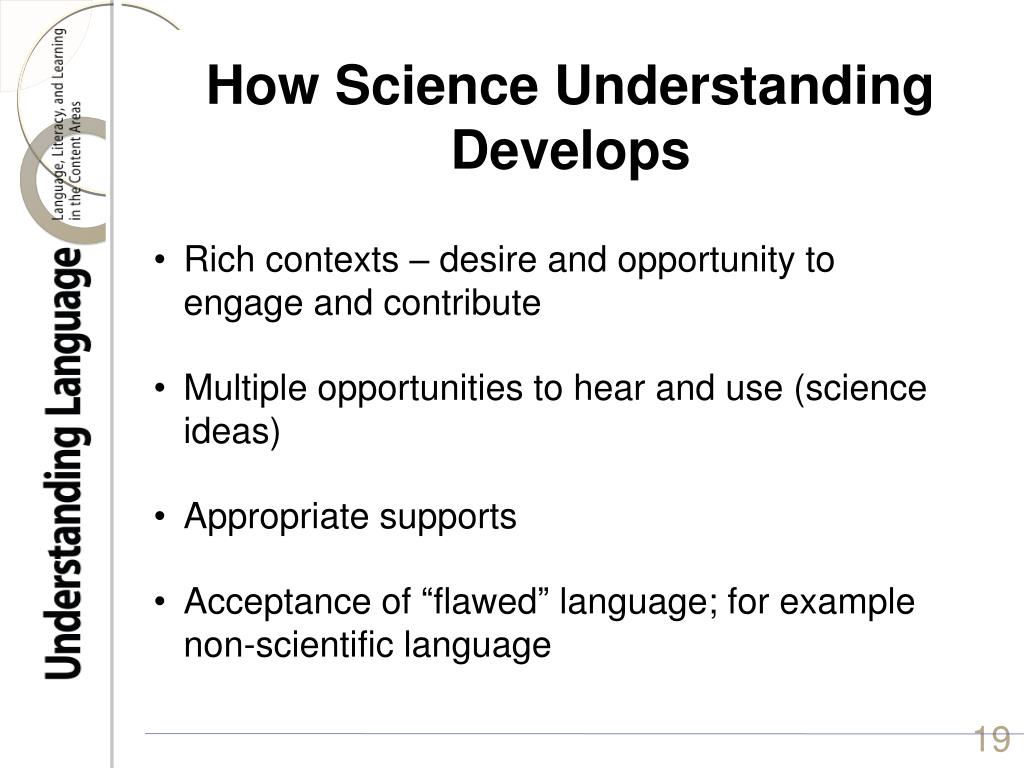 How Science Understanding Develops • Rich contexts – desire and opportunity to engage and contribute • Multiple opportunities to hear and use (science ideas) • Appropriate supports • Acceptance of “flawed” language; for example non-scientific language 19