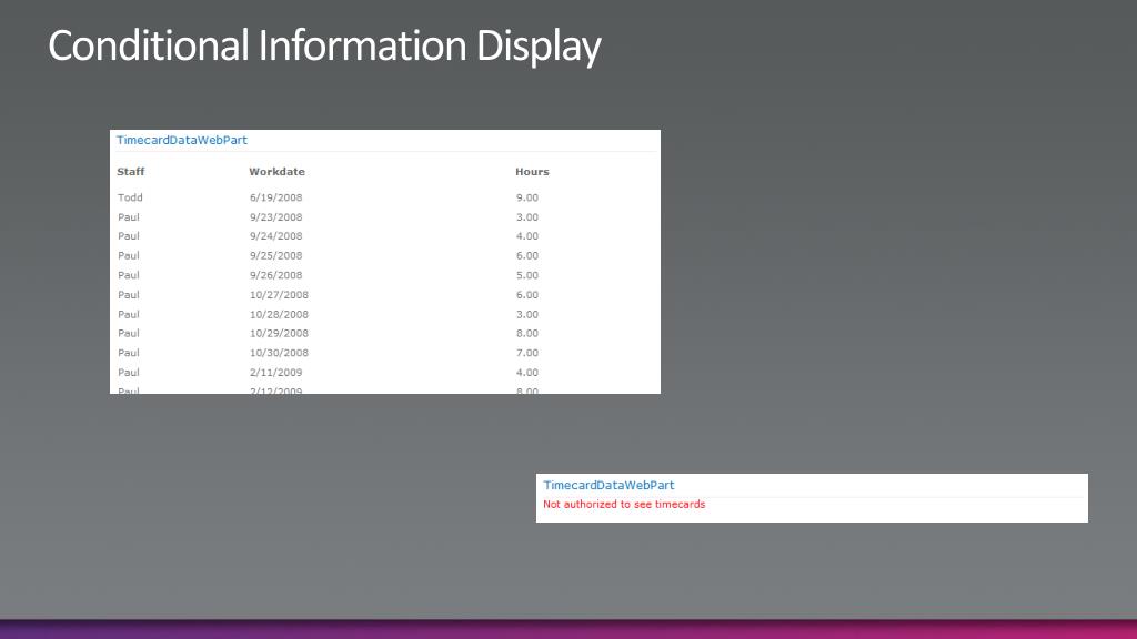Conditional Information Display IClaimsPrincipalclaimsPrincipal = Page.UserasIClaimsPrincipal; IClaimsIdentityclaimsIdentity = (IClaimsIdentity)claimsPrincipal.Identity; stringpmClaim = (from c inclaimsIdentity.Claims wherec.ClaimType == CLAIM_TYPE selectc.Value).FirstOrDefault(); boolauthorized = bool.Parse(pmClaim);