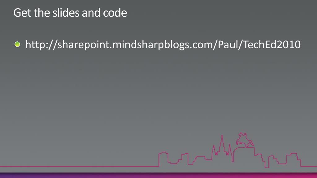 Get the slides and code • http://sharepoint.mindsharpblogs.com/Paul/TechEd2010