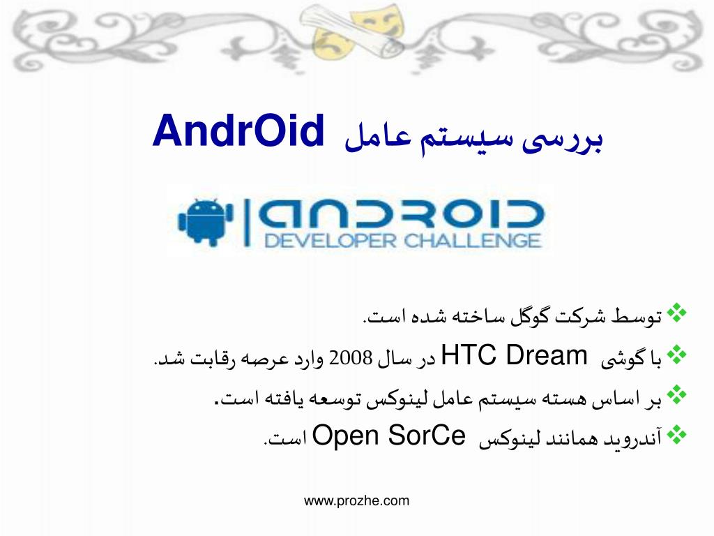 AndrOid بررسی سیستم عامل • توسط شرکت گوگل ساخته شده است. • با گوشی HTC Dream در سال 2008 وارد عرصه رقابت شد. • بر اساس هسته سيستم عامل لينوکس توسعه يافته است. • آندرويد همانند لينوکس Open SorCe است. www.prozhe.com