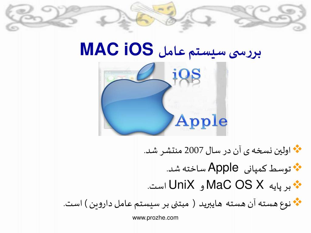 بررسی سیستم عامل MAC iOS • اولین نسخه ی آن در سال 2007 منتشر شد. • توسط کمپانی Apple ساخته شد. • بر پایه MaC OS X و UniX است. • نوع هسته آن هستههایبرید( مبتنی بر سیستم عامل داروین ) است. www.prozhe.com