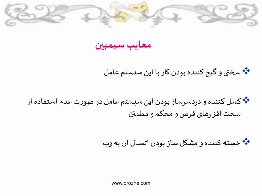 معایب سیمبین • سختی و گیج کننده بودن کار با این سیستم عامل • کسل کننده و دردسرساز بودن این سیستم عامل در صورت عدم استفاده از سخت افزارهای قرص و محکم و مطمئن • خسته کننده و مشکل ساز بودن اتصال آن به وب www.prozhe.com