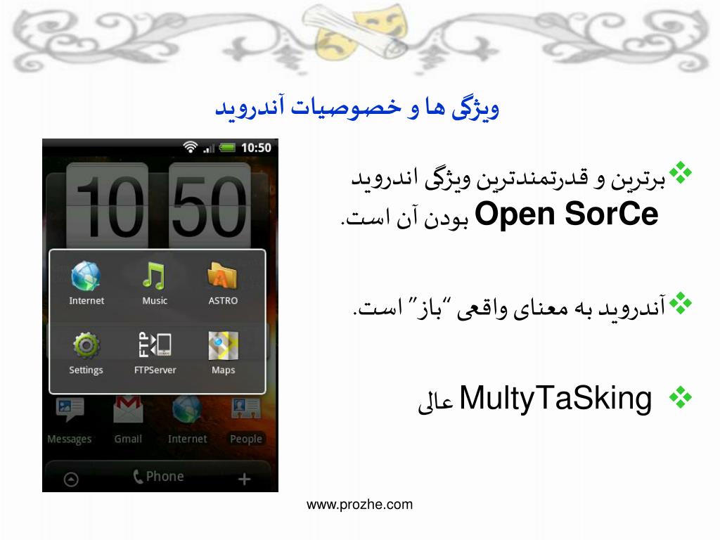 ویژگی ها و خصوصیات آندروید • برترین و قدرتمندترین ویژگی اندروید OpenSorCe بودن آن است. • آندروید به معنای واقعی “باز” است. • MultyTaSking عالی www.prozhe.com