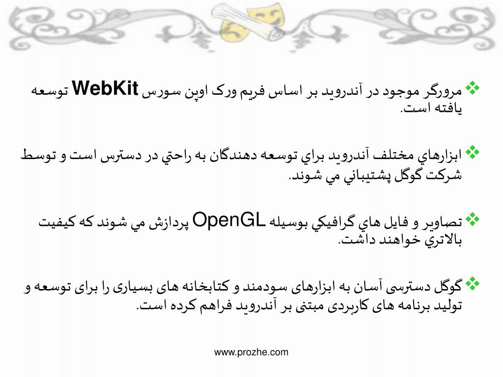 مرورگر موجود در آندرويد بر اساس فريم ورک اوپن سورس WebKit توسعه يافته است. • ابزارهاي مختلف آندرويد براي توسعه دهندگان به راحتي در دسترس است و توسط شرکت گوگل پشتيباني مي شوند. • تصاوير و فايل هاي گرافيکي بوسيله OpenGL پردازش مي شوند که کيفيت بالاتري خواهند داشت. • گوگل دسترسی آسان به ابزارهای سودمند و کتابخانه های بسیاری را برای توسعهو تولید برنامه های کاربردی مبتنی بر آندروید فراهم کرده است. www.prozhe.com