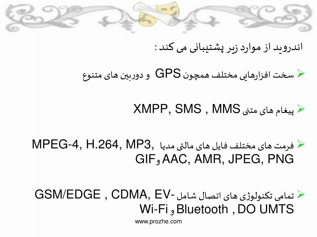 اندروید از موارد زیر پشتیبانی می کند : • سخت افزارهايی مختلف همچونGPSو دوربين های متنوع • پيغام های متنی XMPP, SMS , MMS • فرمت های مختلف فايل های مالتی مديا MPEG-4, H.264, MP3, AAC, AMR, JPEG, PNG و GIF • تمامی تکنولوژی های اتصال شامل GSM/EDGE , CDMA, EV-DO UMTSBluetooth , و Wi-Fi www.prozhe.com