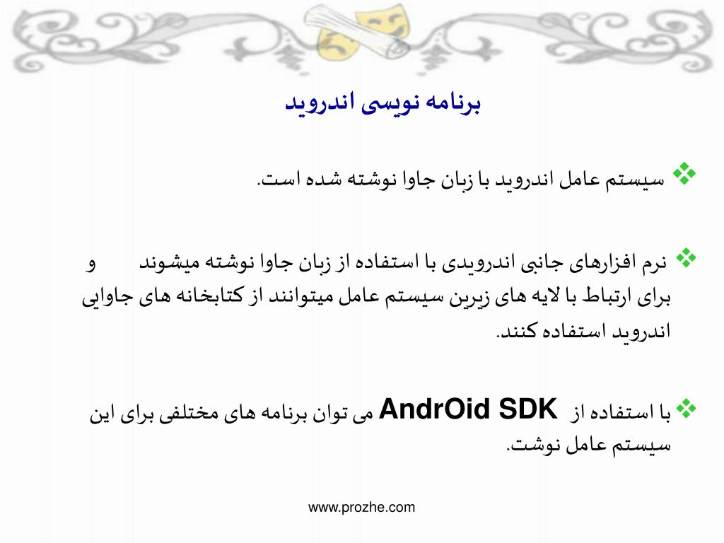 برنامه نویسی اندروید • سیستم عامل اندروید با زبان جاوا نوشته شده است. • نرم افزارهای جانبی اندرویدی با استفاده از زبان جاوا نوشته میشوند و برای ارتباط با لایه های زیرین سیستم عامل میتوانند از کتابخانههای جاوایی اندروید استفاده کنند. • با استفاده ازAndrOidSDK می توان برنامه های مختلفی برای این سیستم عامل نوشت. www.prozhe.com