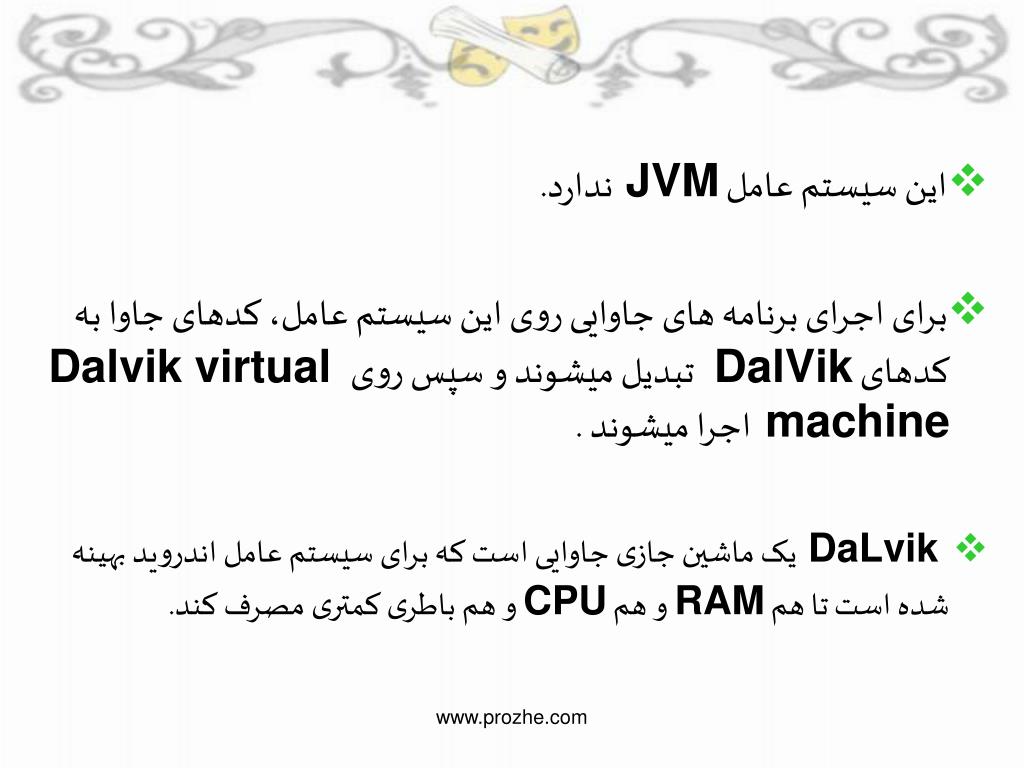 این سیستم عامل JVMندارد. • برای اجرای برنامه های جاوایی روی این سیستم عامل، کدهای جاوا بهکدهای DalVikتبدیل میشوند و سپس روی Dalvik virtual machineاجرا میشوند . • DaLvikیک ماشین جازی جاوایی است که برای سیستم عامل اندروید بهینه شده است تا هم RAM و هم CPU و هم باطری کمتری مصرف کند. www.prozhe.com