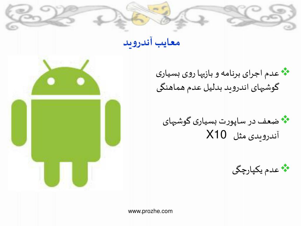 معایب آندروید • عدم اجرای برنامه و بازیها روی بسیاری گوشیهای اندروید بدلیل عدم هماهنگی • ضعف در ساپورت بسیاری گوشیهای آندرویدی مثل X10 • عدم یکپارچگی www.prozhe.com