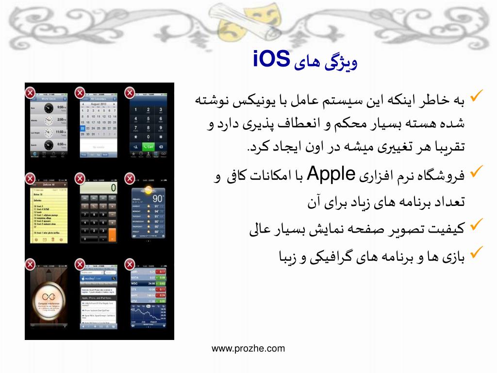ویژگی های iOS • به خاطر اینکه این سیستم عامل با یونیکس نوشته شده هسته بسیار محکم و انعطاف پذیری دارد و تقریبا هر تغییری میشه در اون ایجاد کرد. • فروشگاه نرم افزاری Apple با امکانات کافی و تعداد برنامه های زیاد برای آن • کیفیت تصویر صفحه نمایش بسیار عالی • بازی ها و برنامه های گرافیکی و زیبا www.prozhe.com