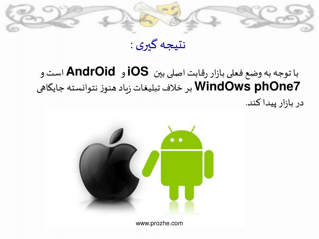 نتیجه گیری : با توجه به وضع فعلی بازار رقابت اصلی بین iOS و AndrOid است و WindOwsphOne7 بر خلاف تبلیغات زیاد هنوز نتوانسته جایگاهی در بازار پیدا کند. www.prozhe.com