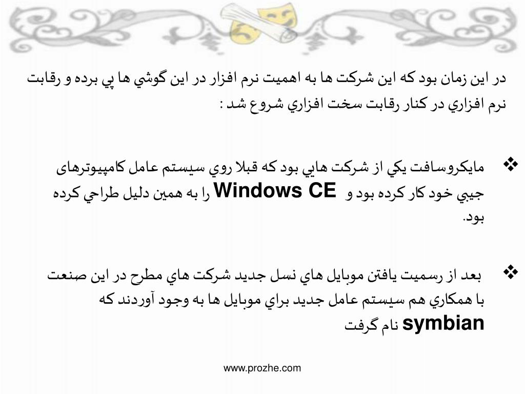 در اين زمان بود كه اين شركت ها به اهميت نرم افزار در اين گوشي ها پي برده و رقابت نرم افزاري در كنار رقابت سخت افزاري شروع شد : • مايكروسافت يكي از شركت هايي بود كه قبلا روي سيستم عامل كامپيوترهای جيبي خود كار كرده بود وWindows CE را به همين دليل طراحي كرده بود. • بعد از رسميت يافتن موبايل هاي نسل جديد شركت هاي مطرح در اين صنعت با همكاري هم سيستم عامل جديد براي موبايل ها به وجود آوردند كهsymbian نام گرفت www.prozhe.com
