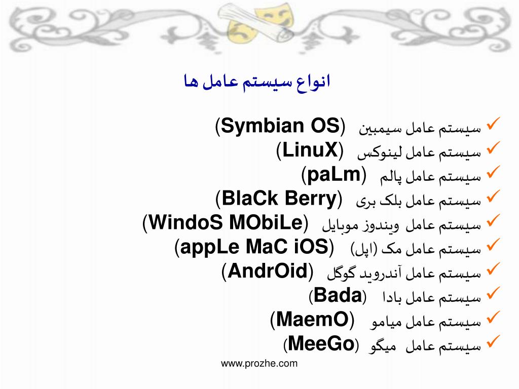 انواع سیستم عامل ها • سيستم عامل سيمبين (SymbianOS) • سيستم عامل لینوکس (LinuX) • سيستم عامل پالم (paLm) • سيستم عامل بلک بری (BlaCkBerry) • سيستم عامل ویندوز موبایل (WindoSMObiLe) • سيستم عامل مک (اپل) (appLeMaCiOS) • سيستم عامل آندروید گوگل (AndrOid) • سيستم عامل بادا (Bada) • سيستم عامل میامو (MaemO) • سيستم عامل میگو (MeeGo) www.prozhe.com