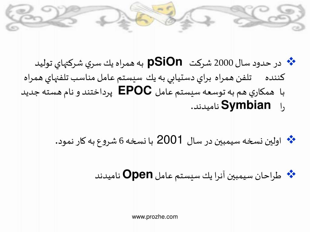 Symbian OSبررسی سیستم عامل • سال تاسیس این شرکت نرم افزاری : 1998 • هدف از تاسیس این شرکت : کار بر روی سیستم عاملی برای کار روی موبایلها • مقر اصلی تاسیس این شرکت : انگلیس • پايه و اساس سيمبين : PSiOn , EPOC (بر پایه C++) www.prozhe.com