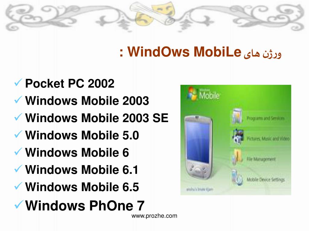 ورژن های : WindOws MobiLe • Pocket PC 2002 • Windows Mobile 2003 • Windows Mobile 2003 SE • Windows Mobile 5.0 • Windows Mobile 6 • Windows Mobile 6.1 • Windows Mobile 6.5 • Windows PhOne 7 www.prozhe.com
