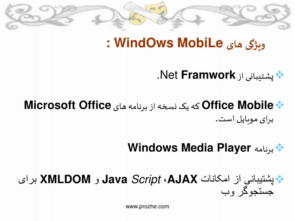 ویژگیهای: WindOws MobiLe • پشتیبانی از .Net Framwork • OfficeMobile که یک نسخه از برنامه های MicrosoftOffice برای موبایل است. • برنامهWindows Media Player • پشتیبانی از امکانات AJAX، JavaScript و XMLDOM برای جستجوگر وب www.prozhe.com