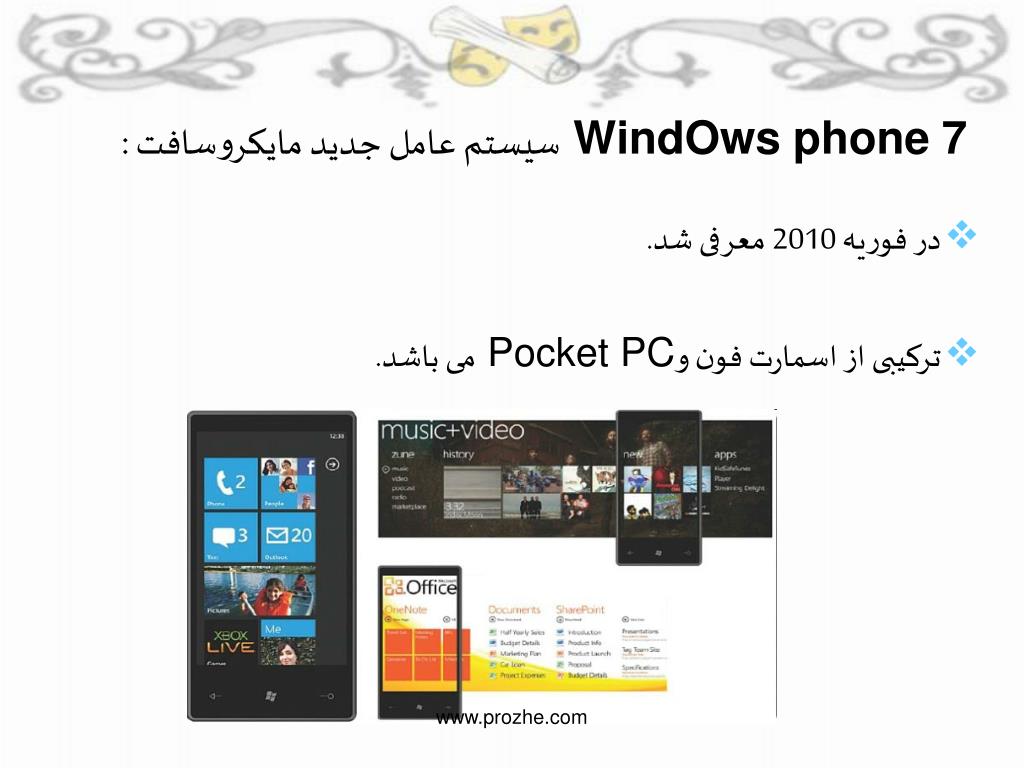 WindOws phone 7 سیستم عامل جدید مایکروسافت : • در فوریه 2010 معرفی شد. • ترکیبی از اسمارت فون و Pocket PCمی باشد. www.prozhe.com