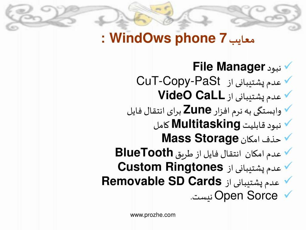 معایبWindOws phone 7 : • نبود FileManager • عدم پشتیبانی از CuT-Copy-PaSt • عدم پشتیبانی از VideOCaLL • وابستگی به نرم افزار Zune برای انتقال فایل • نبود قابلیت Multitaskingکامل • حذف امکان MassStorage • عدم امکان انتقال فایل از طریق BlueTooth • عدم پشتیبانی از CustomRingtones • عدم پشتیبانی ازRemovableSDCards • Open Sorce نیست. www.prozhe.com