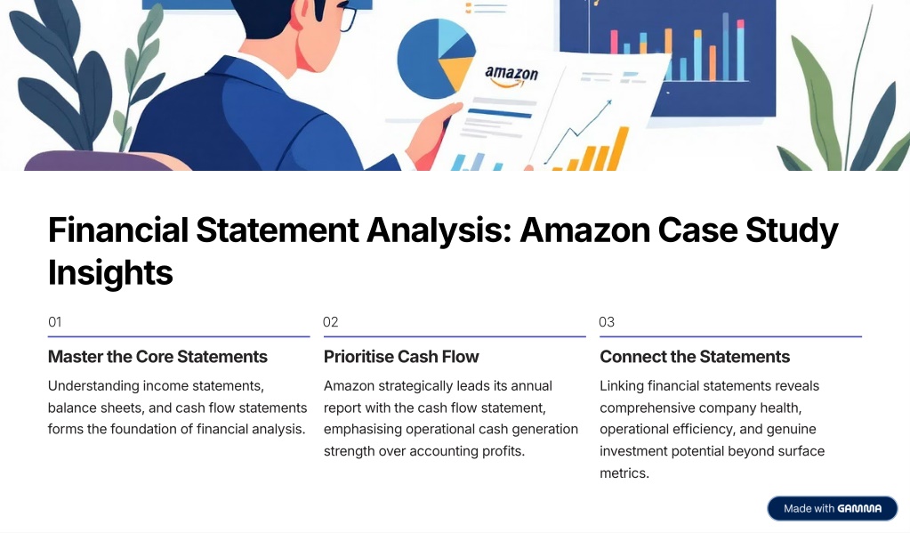 Financial Statement Analysis: Amazon Case Study Insights 01 02 03 Master the Core Statements Prioritise Cash Flow Connect the Statements Understanding income statements, balance sheets, and cash flow statements forms the foundation of financial analysis. Amazon strategically leads its annual report with the cash flow statement, emphasising operational cash generation strength over accounting profits. Linking financial statements reveals comprehensive company health, operational efficiency, and genuine investment potential beyond surface metrics.