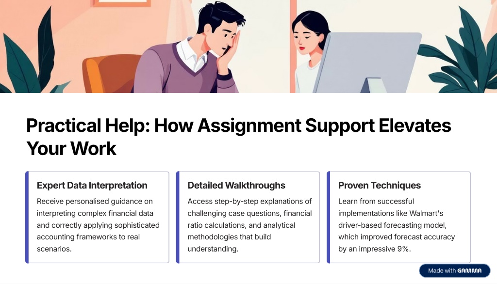 Practical Help: How Assignment Support Elevates Your Work Expert Data Interpretation Detailed Walkthroughs Proven Techniques Receive personalised guidance on interpreting complex financial data and correctly applying sophisticated accounting frameworks to real scenarios. Access step-by-step explanations of challenging case questions, financial ratio calculations, and analytical methodologies that build understanding. Learn from successful implementations like Walmart's driver-based forecasting model, which improved forecast accuracy by an impressive 9%.