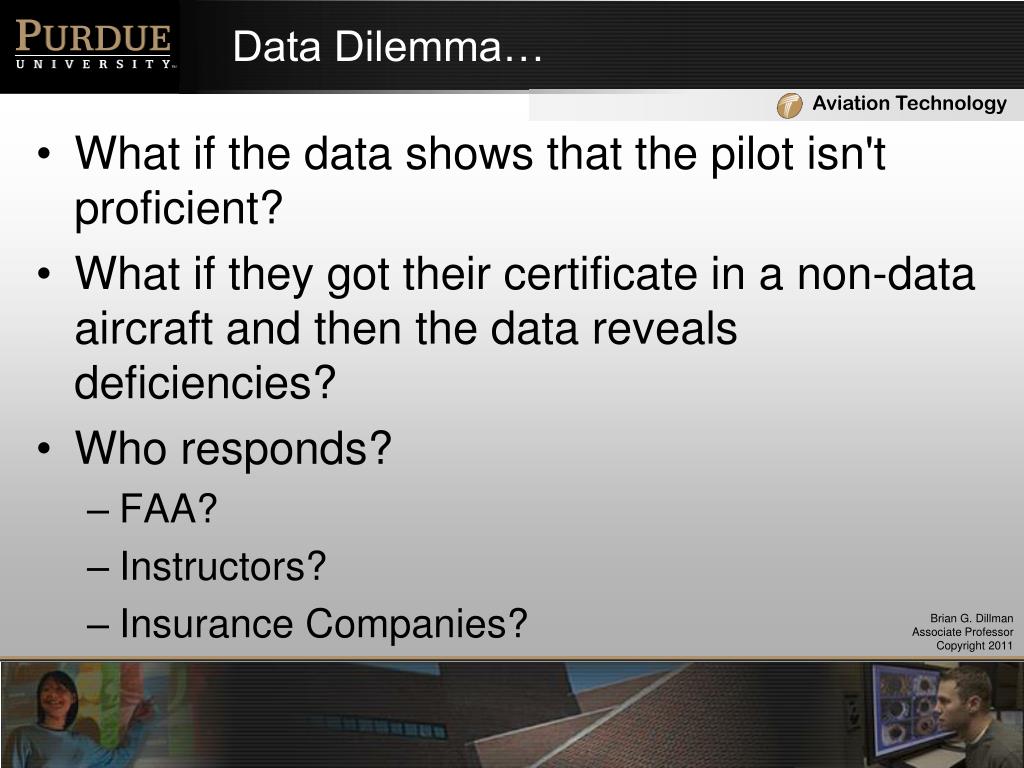 Data Dilemma… • What if the data shows that the pilot isn't proficient? • What if they got their certificate in a non-data aircraft and then the data reveals deficiencies? • Who responds? • FAA? • Instructors? • Insurance Companies?