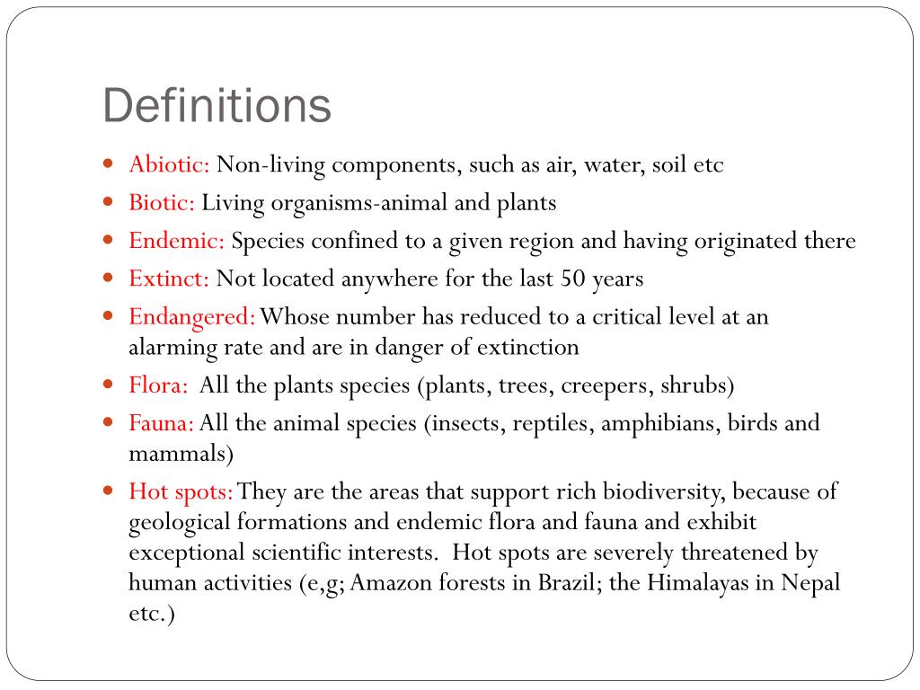 Definitions • Abiotic: Non-living components, such as air, water, soil etc • Biotic: Living organisms-animal and plants • Endemic: Species confined to a given region and having originated there • Extinct: Not located anywhere for the last 50 years • Endangered: Whose number has reduced to a critical level at an alarming rate and are in danger of extinction • Flora: All the plants species (plants, trees, creepers, shrubs) • Fauna: All the animal species (insects, reptiles, amphibians, birds and mammals) • Hot spots: They are the areas that support rich biodiversity, because of geological formations and endemic flora and fauna and exhibit exceptional scientific interests. Hot spots are severely threatened by human activities (e,g; Amazon forests in Brazil; the Himalayas in Nepal etc.)