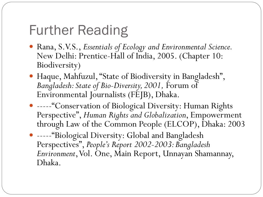Further Reading • Rana, S.V.S., Essentials of Ecology and Environmental Science. New Delhi: Prentice-Hall of India, 2005. (Chapter 10: Biodiversity) • Haque, Mahfuzul, “State of Biodiversity in Bangladesh”, Bangladesh: State of Bio-Diversity, 2001, Forum of Environmental Journalists (FEJB), Dhaka. • -----“Conservation of Biological Diversity: Human Rights Perspective”, Human Rights and Globalization, Empowerment through Law of the Common People (ELCOP), Dhaka: 2003 • -----“Biological Diversity: Global and Bangladesh Perspectives”, People’s Report 2002-2003: Bangladesh Environment, Vol. One, Main Report, UnnayanShamannay, Dhaka.