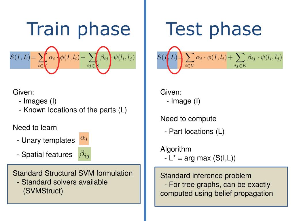Test phase Train phase Given: - Images (I) - Known locations of the parts (L) Need to learn - Unary templates - Spatial features Given: - Image (I) Need to compute - Part locations (L) Algorithm - L* = arg max (S(I,L)) Standard Structural SVM formulation - Standard solvers available (SVMStruct)