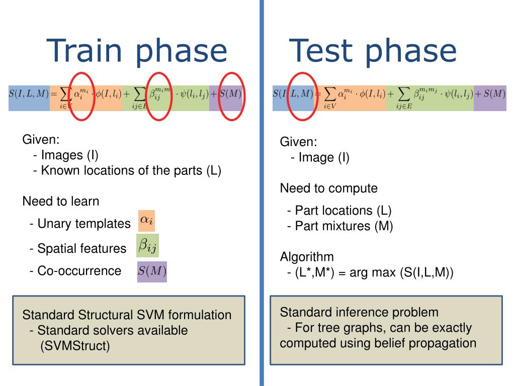 Test phase Train phase Given: - Images (I) - Known locations of the parts (L) Need to learn - Unary templates - Spatial features - Co-occurrence Given: - Image (I) Need to compute - Part locations (L) - Part mixtures (M) Algorithm - (L*,M*) = arg max (S(I,L,M)) Standard inference problem - For tree graphs, can be exactly computed using belief propagation Standard Structural SVM formulation - Standard solvers available (SVMStruct)