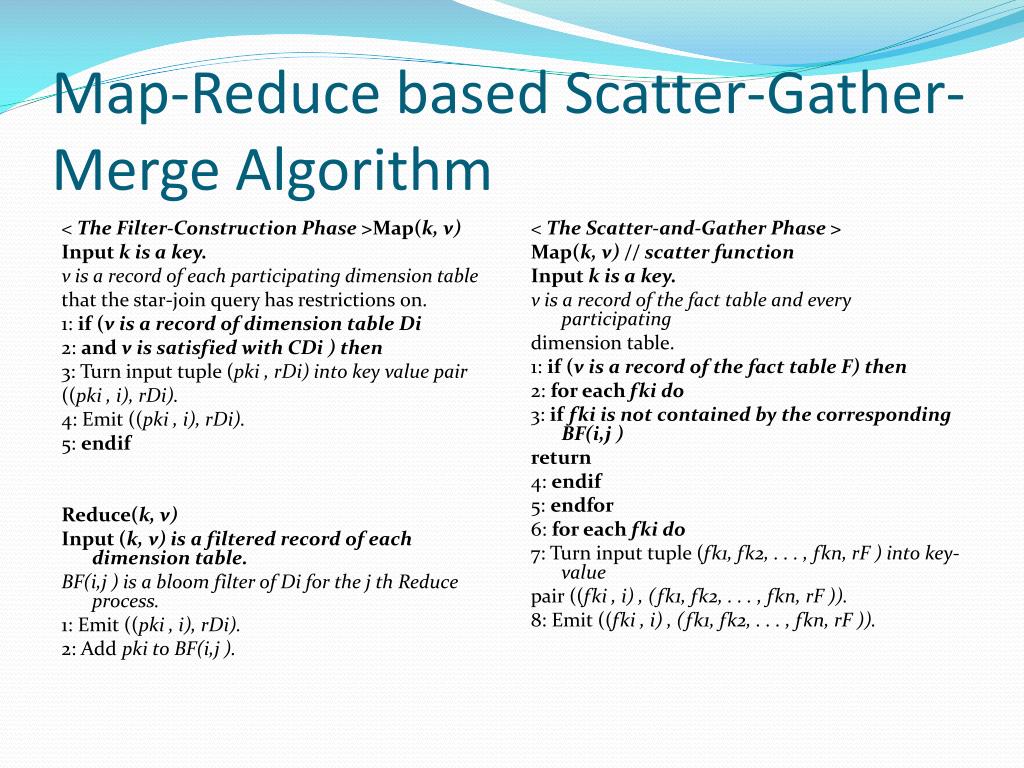 Algorithm for IO Reduction Algorithm 2 (Scatter-Gather-Merge algorithm) Filter-Construction(r) Input r is a record. BFi is a bloom filter of Di . 1: if (r is a record of dimension table Di 2: and r is satisfied with CDi ) then 3: Store and Distribute r. 4: Add pki to BFi . 5: endif Scatter(r) Input r is a record. 1: if (v is a record of the fact table F) then 2: for each fki do 3: if fki is not contained by the corresponding BFi return 4: endif 5: endfor 6: for each fki do 7: Turn input tuple (fk1, fk2, . . . , fkn, rF ) into key value pair ((fki , i), (fk1, fk2, . . . , fkn, rF )). 8: Store and Distribute ((fki , i) , (fk1, fk2, . . . , fkn, rF )). 9: endfor 10: endif 11: if (r is a record of dimension table Di ) then 12: Turn input tuple (pki , rDi) into key-value pair ((pki , i), rDi). 13: Store and Distribute ((pki , i), rDi). 14: endif