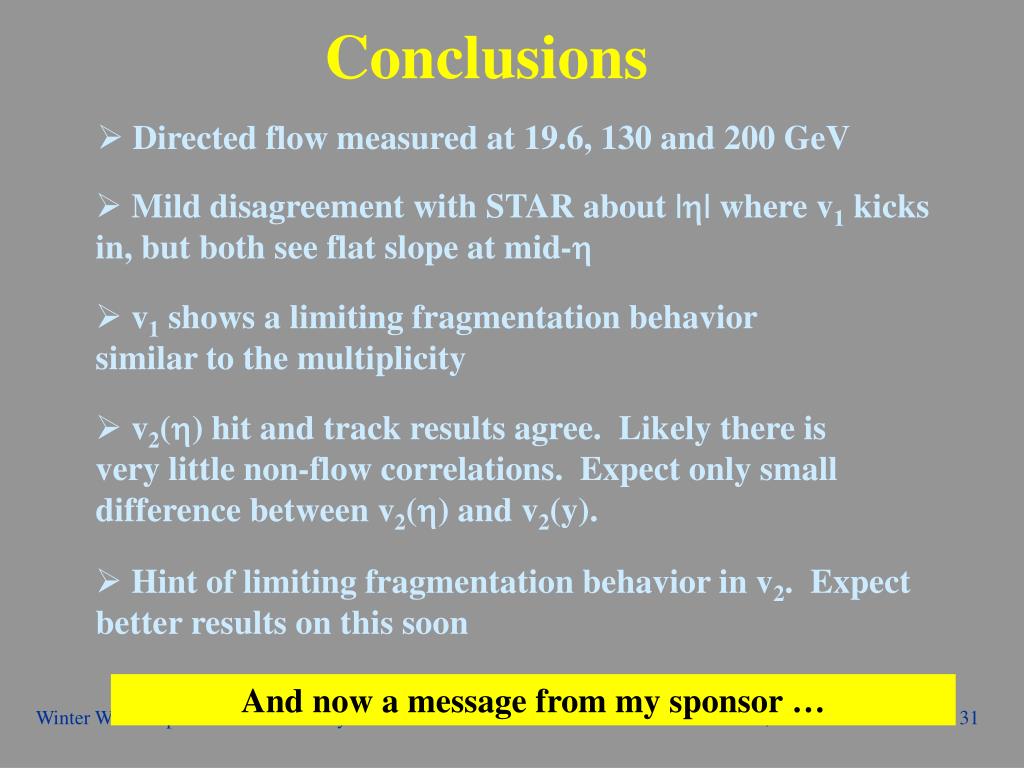 Conclusions • Directed flow measured at 19.6, 130 and 200 GeV • Mild disagreement with STAR about || where v1 kicks in, but both see flat slope at mid- • v1 shows a limiting fragmentation behavior similar to the multiplicity • v2() hit and track results agree. Likely there is very little non-flow correlations. Expect only small difference between v2() and v2(y). • Hint of limiting fragmentation behavior in v2. Expect better results on this soon And now a message from my sponsor … Winter Workshop - Jamaica - S. Manly