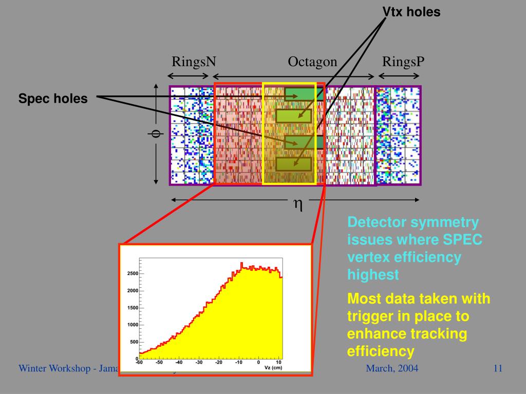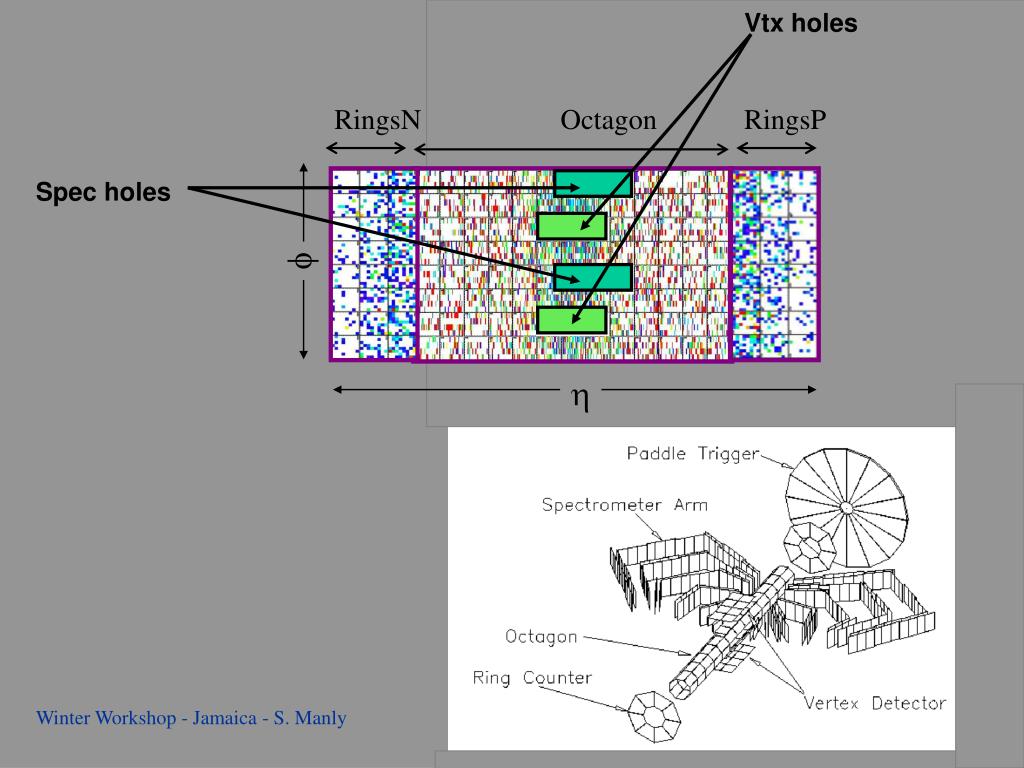 Vtx holes Spec holes RingsN Octagon RingsP f h Detector symmetry issues where SPEC vertex efficiency highest Most data taken with trigger in place to enhance tracking efficiency Winter Workshop - Jamaica - S. Manly