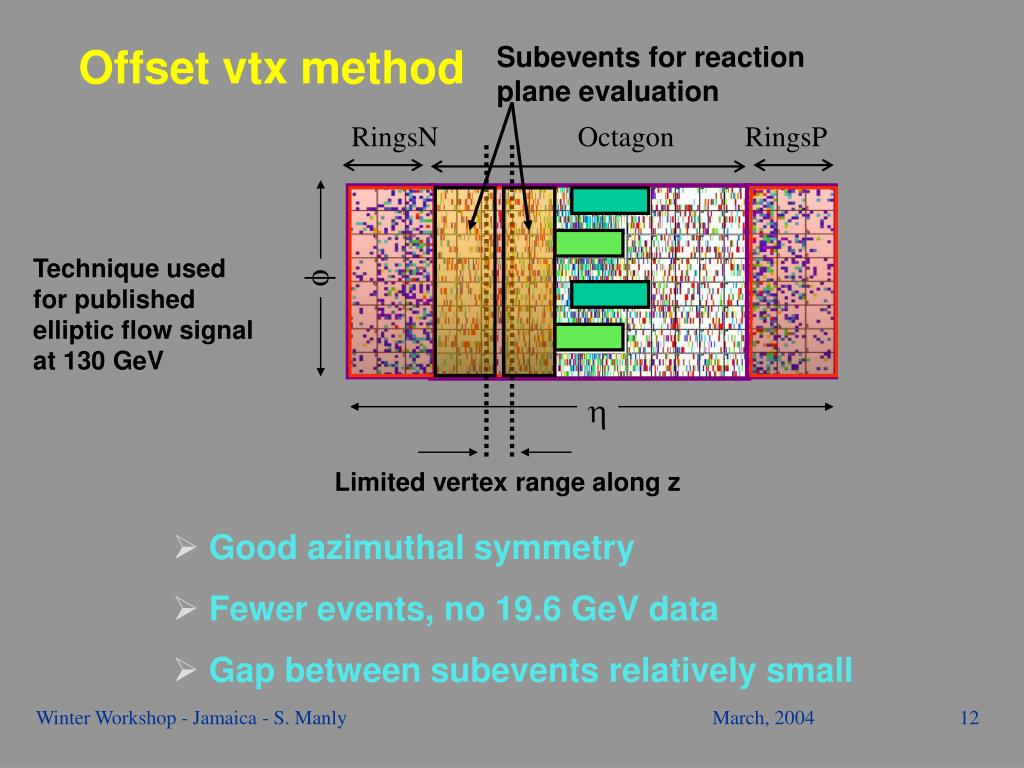 RingsN Octagon RingsP f h Limited vertex range along z Offset vtx method Subevents for reaction plane evaluation Technique used for published elliptic flow signal at 130 GeV • Good azimuthal symmetry • Fewer events, no 19.6 GeV data • Gap between subevents relatively small Winter Workshop - Jamaica - S. Manly