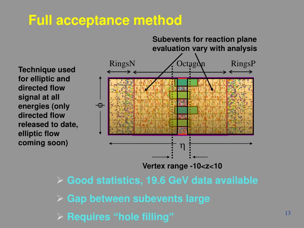 RingsN Octagon RingsP Vertex range -10<z<10 f h Full acceptance method Subevents for reaction plane evaluation vary with analysis Technique used for elliptic and directed flow signal at all energies (only directed flow released to date, elliptic flow coming soon) • Good statistics, 19.6 GeV data available • Gap between subevents large • Requires “hole filling” Winter Workshop - Jamaica - S. Manly