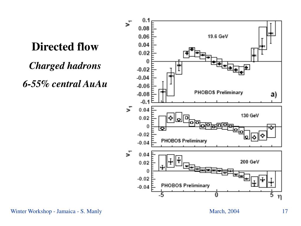 v1 PHOBOS Preliminary PHOBOS AuAu √sNN=19.6 GeV 6-55% h± p± NA49 PbPb √sNN=17.2 GeV Minimum Bias Phys.Rev.C68, 034903, 2003 19.6 GeV AuAu & 17.2 GeV PbPb h Winter Workshop - Jamaica - S. Manly