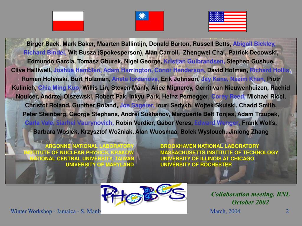 Birger Back,Mark Baker, Maarten Ballintijn, Donald Barton, Russell Betts, Abigail Bickley, Richard Bindel,Wit Busza (Spokesperson), Alan Carroll, Zhengwei Chai, Patrick Decowski, Edmundo Garcia, Tomasz Gburek, Nigel George, Kristjan Gulbrandsen, Stephen Gushue, Clive Halliwell, Joshua Hamblen, Adam Harrington, Conor Henderson, David Hofman, Richard Hollis, Roman Hołyński, Burt Holzman, Aneta Iordanova, Erik Johnson, Jay Kane, Nazim Khan, Piotr Kulinich, Chia Ming Kuo, Willis Lin, Steven Manly, Alice Mignerey, Gerrit van Nieuwenhuizen, Rachid Nouicer, Andrzej Olszewski, Robert Pak, Inkyu Park, Heinz Pernegger, Corey Reed, Michael Ricci, Christof Roland, Gunther Roland, Joe Sagerer, Iouri Sedykh, Wojtek Skulski, Chadd Smith, Peter Steinberg, George Stephans, Andrei Sukhanov, Marguerite Belt Tonjes, Adam Trzupek, Carla Vale, Siarhei Vaurynovich, Robin Verdier, Gábor Veres, Edward Wenger, Frank Wolfs, Barbara Wosiek, Krzysztof Wožniak, Alan Wuosmaa, Bolek Wysłouch, Jinlong Zhang ARGONNE NATIONAL LABORATORY BROOKHAVEN NATIONAL LABORATORY INSTITUTE OF NUCLEAR PHYSICS, KRAKOW MASSACHUSETTS INSTITUTE OF TECHNOLOGY NATIONAL CENTRAL UNIVERSITY, TAIWAN UNIVERSITY OF ILLINOIS AT CHICAGO UNIVERSITY OF MARYLAND UNIVERSITY OF ROCHESTER Collaboration meeting, BNL October 2002 Winter Workshop - Jamaica - S. Manly