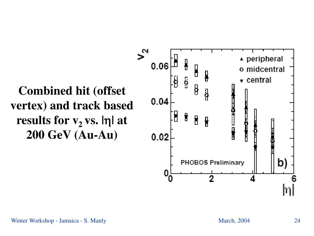 v2 vs. h at 130 and 200 GeV AuAu () PHOBOS Preliminaryv2200 Minimum Bias h± () PHOBOSv2130 Hit-based method ()Nucl.Phys. A715 (2003) 611-614 () PRL 89, 222301 (2002) Winter Workshop - Jamaica - S. Manly