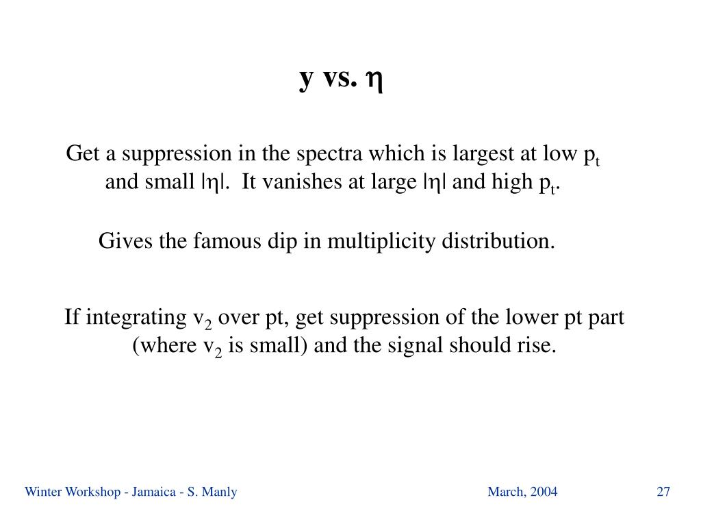 y vs. Get a suppression in the spectra which is largest at low pt and small ||. It vanishes at large || and high pt. Gives the famous dip in multiplicity distribution. If integrating v2 over pt, get suppression of the lower pt part (where v2 is small) and the signal should rise. Winter Workshop - Jamaica - S. Manly