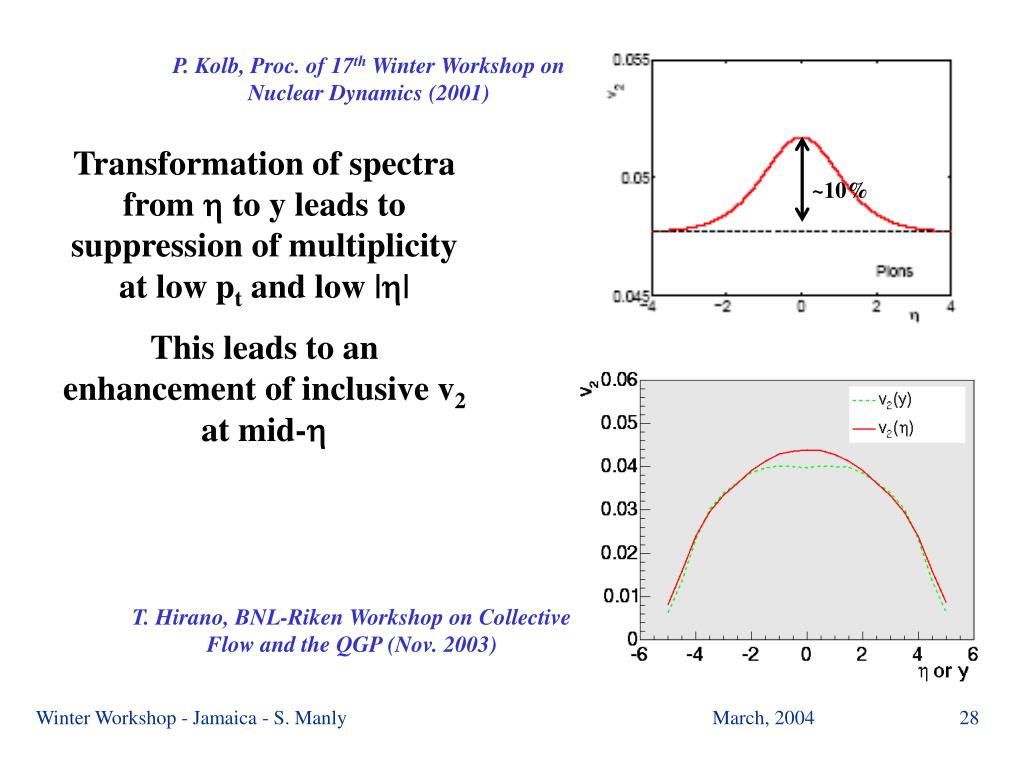 ~10% P. Kolb, Proc. of 17th Winter Workshop on Nuclear Dynamics (2001) Transformation of spectra from to y leads to suppression of multiplicity at low pt and low || This leads to an enhancement of inclusive v2 at mid- T. Hirano, BNL-Riken Workshop on Collective Flow and the QGP (Nov. 2003) Winter Workshop - Jamaica - S. Manly