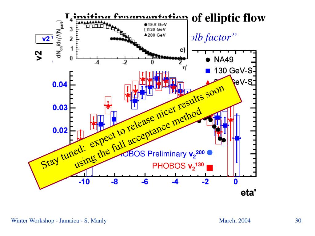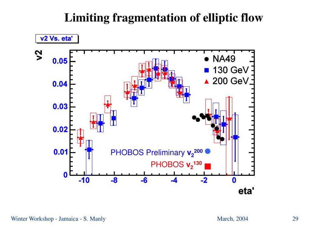 Limiting fragmentation of elliptic flow Scaled by “Kolb factor” Stay tuned: expect to release nicer results soon using the full acceptance method PHOBOS Preliminaryv2200 PHOBOSv2130 Winter Workshop - Jamaica - S. Manly