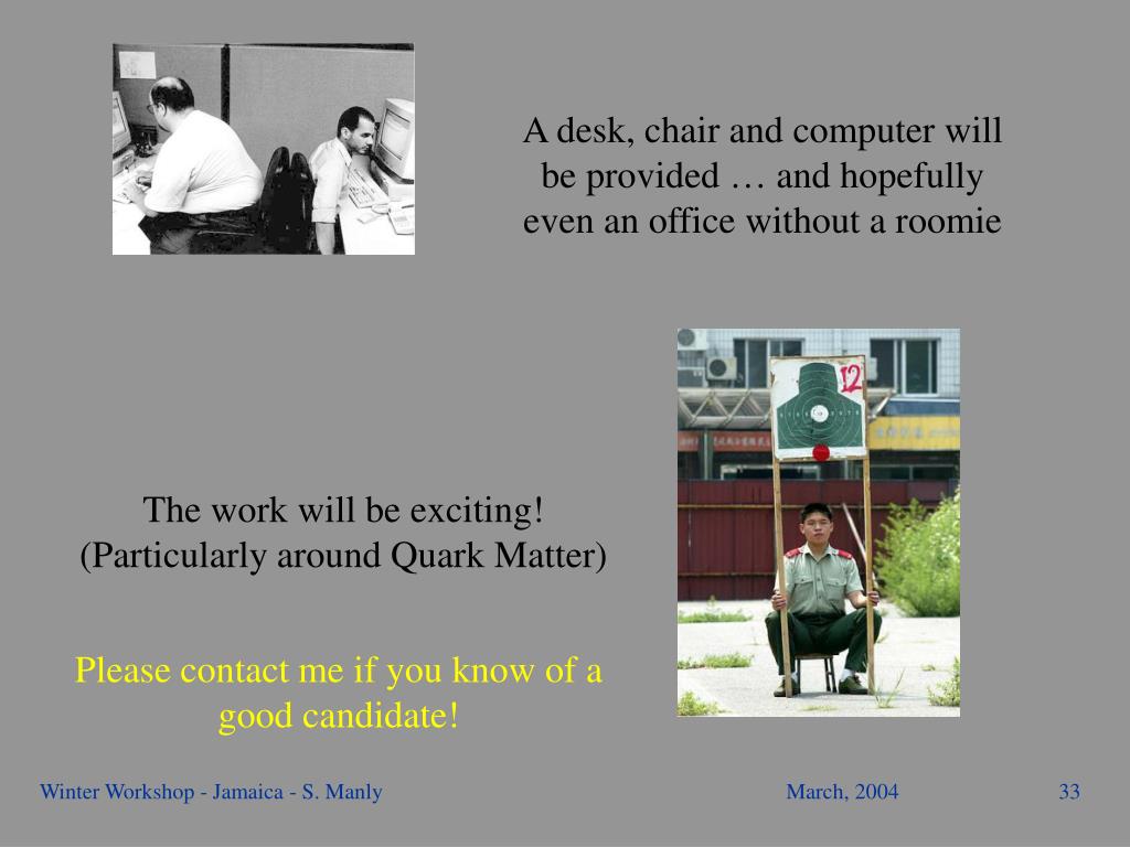 A desk, chair and computer will be provided … and hopefully even an office without a roomie The work will be exciting! (Particularly around Quark Matter) Please contact me if you know of a good candidate! Winter Workshop - Jamaica - S. Manly