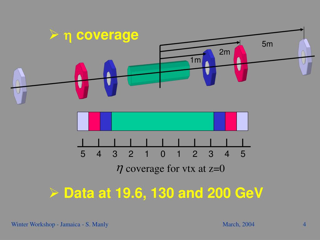 5m 2m 5 4 3 2 1 0 1 2 3 4 5 1m h coverage for vtx at z=0 • coverage • Data at 19.6, 130 and 200 GeV Winter Workshop - Jamaica - S. Manly